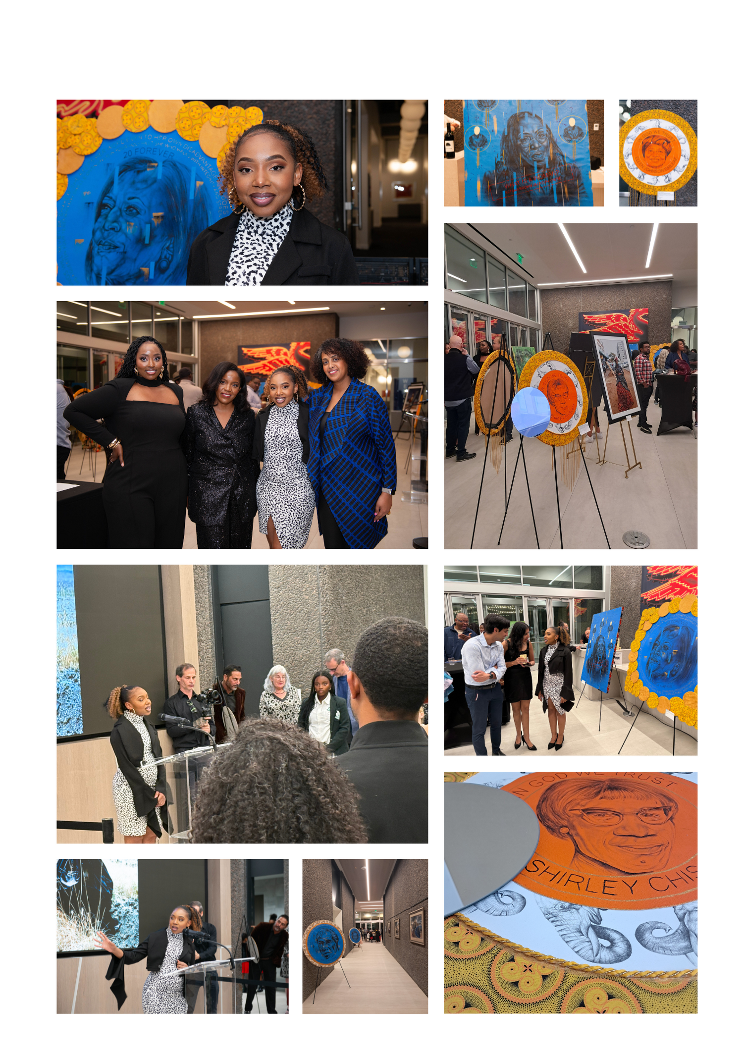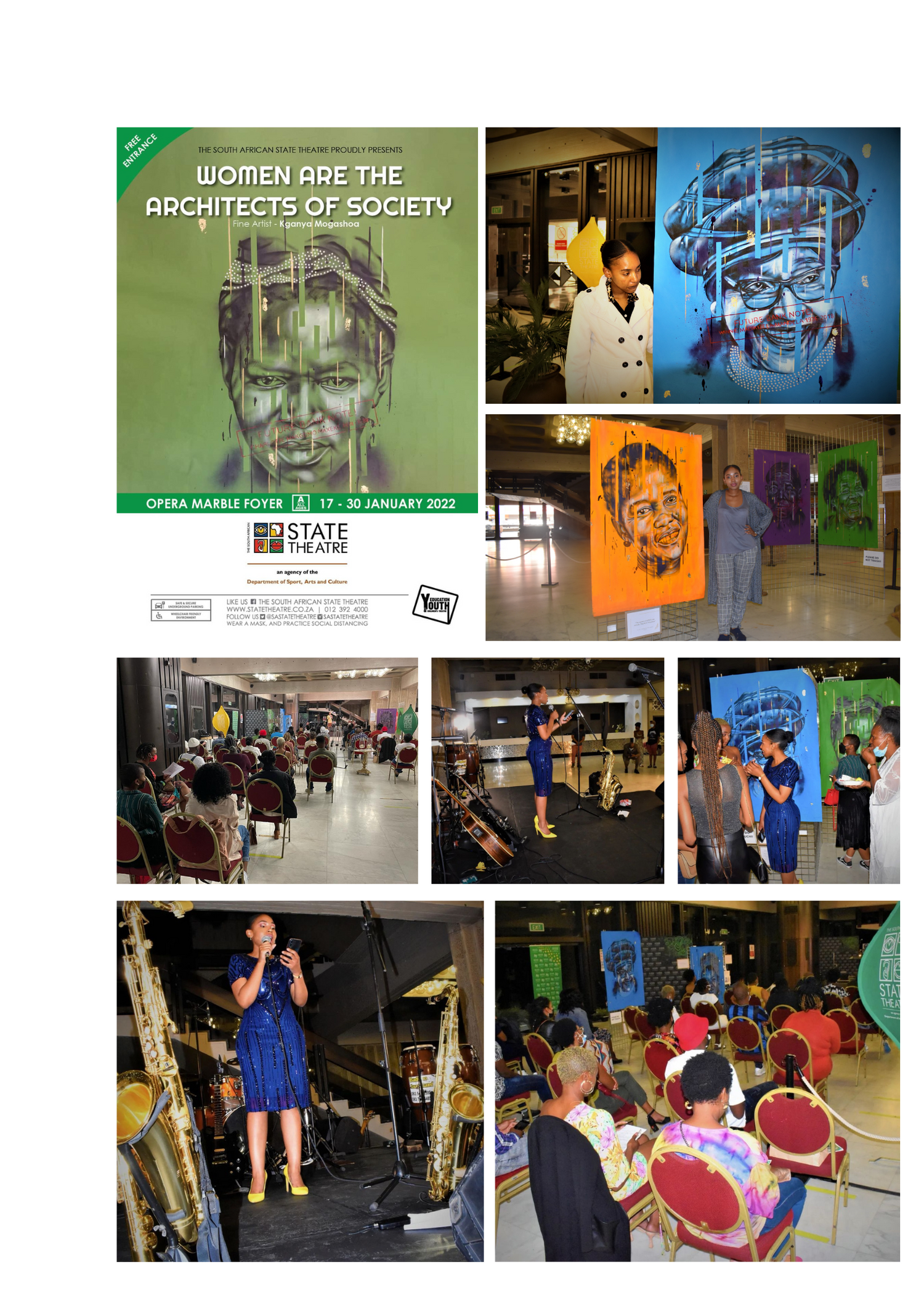 Women Are the Architects of Society is an art series by Kganya Mogashoa, highlighting women's pivotal role in shaping communities. Through mixed-media works, it explores themes of resilience, leadership, and societal influence. This was her first solo exhibition held at the South African State Theatre, highlighting undocumented stories of various women leaders in South Africa and the USA.